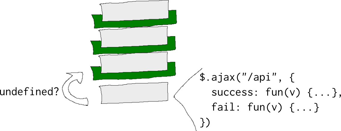 Lots of JavaScript code works asynchronously, with callbacks that are registered to be invoked after the stack clears. The control flow of these callbacks interacts with Pyret’s stack infrastructure. Most callback-using JavaScript code simply returns undefined immediately, and all further computation happens in either success or failure continuations. This doesn’t play nicely with Pyret’s stack-based control flow, because Pyret functions expect a meaningful return value.We could require that all Pyret code that uses JS callback libraries use Pyret callbacks, but it’s hardly elegant to require that all students learn to use callbacks before they can import an image.