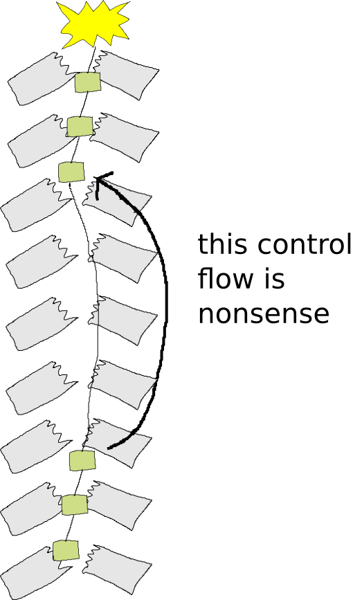 The resulting stack doesn’t accurately represent the program that was being executed. It is, quite literally, nonsense, because a Pyret function will return directly to another Pyret function, ignoring all of the intermediate JavaScript logic. Using this pattern without any guards or protection will create programs that simply produce wrong answers.