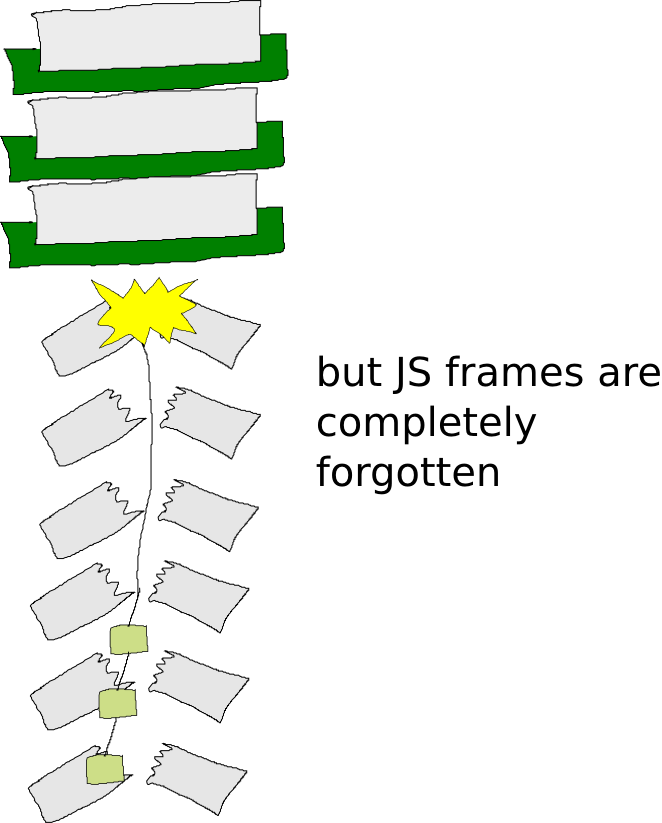 But the pure JavaScript frames have no stack management handlers installed, so they are skipped without consideration for any intermediate state they may contain.