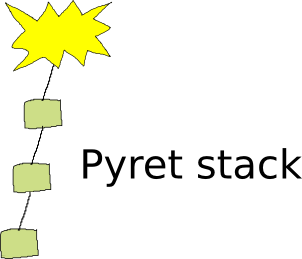 When a Pyret function is compiled, it gets an extra try/catch handler wrapped around it that listens for special Pyret-specific exceptions. That means when it’s running, we can think of the stack frame of the function as having an extra layer around it: