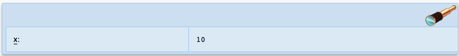 Both of these outputs indicate that the name was x and the value was 10. In the text output, the line and column information is printed (this happened at line 2). In the visual output, the x is underlined – clicking it will scroll the editor to the line of the spy statement and highlight the corresponding use of x.